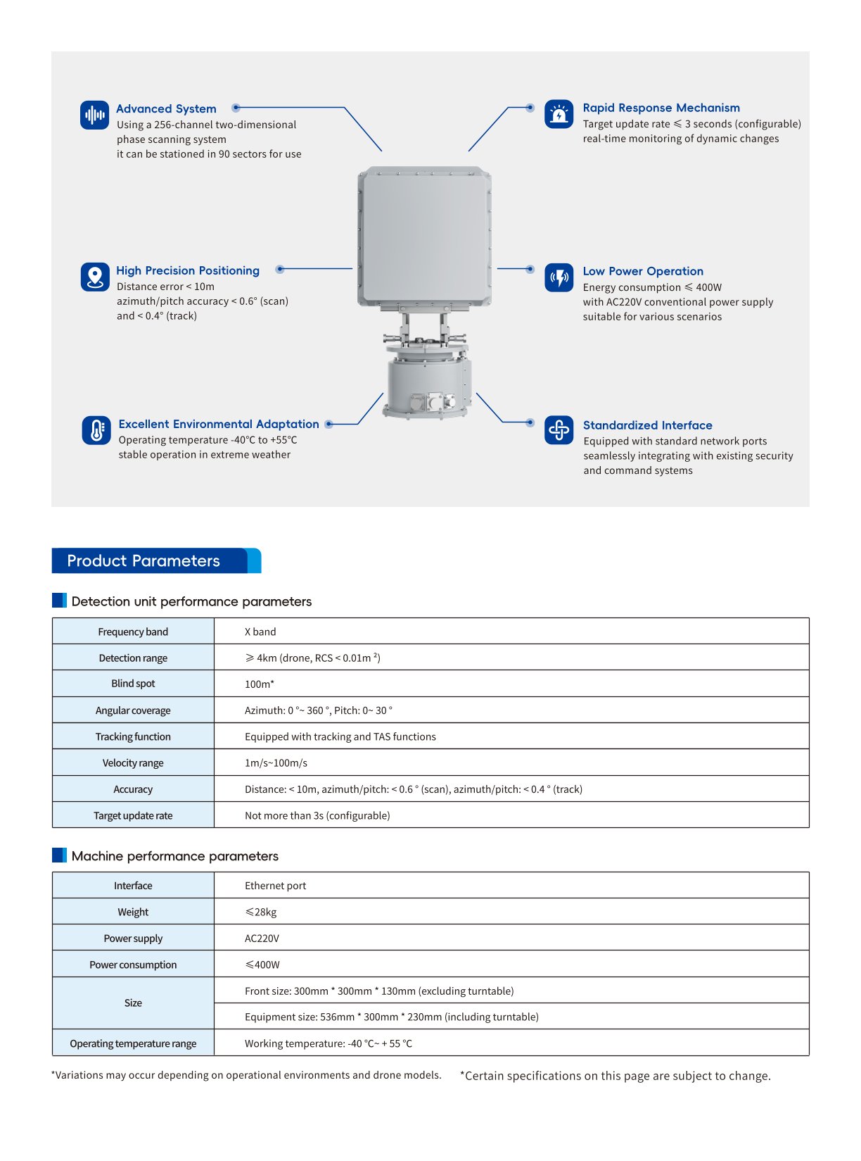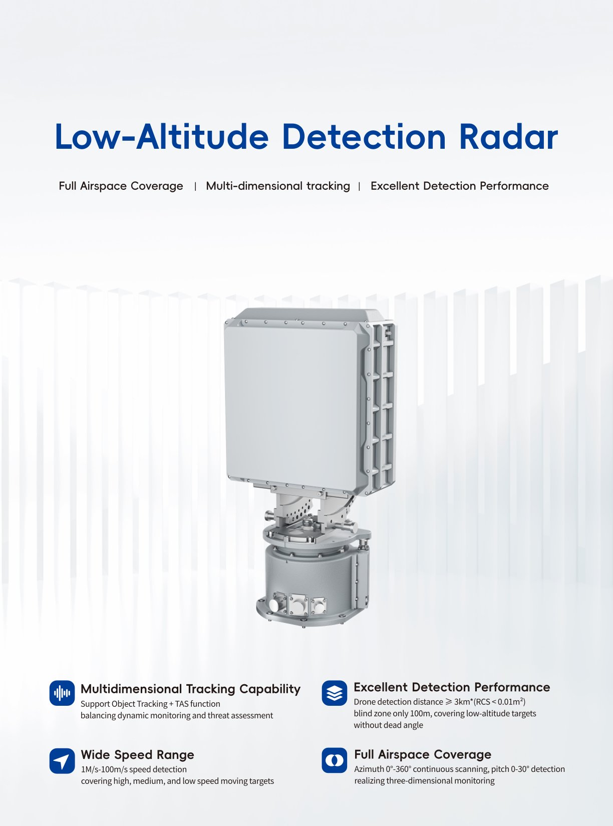 Optimized for critical infrastructure protection, the radar is ideally suited for deployment in airports, border areas, energy facilities, and other key sites where continuous low-altitude awareness, rapid response, and seamless system integration are essential.